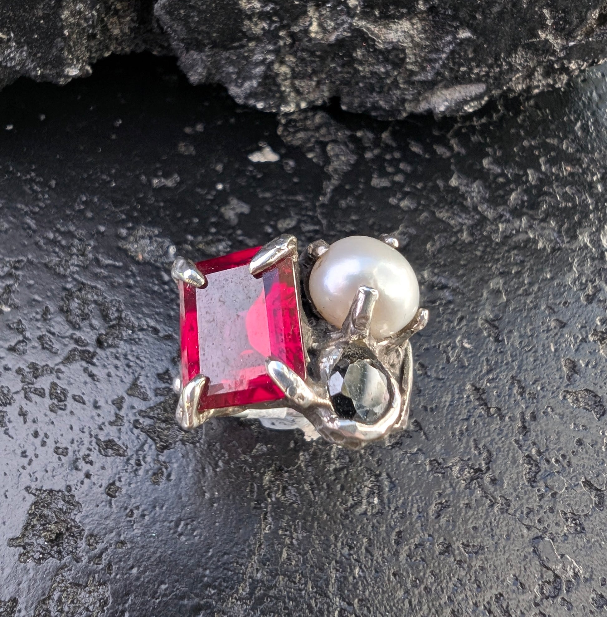Confect #1 features a 12x10mm lab created ruby, a freshwater pearl and a black cubic zirconia.