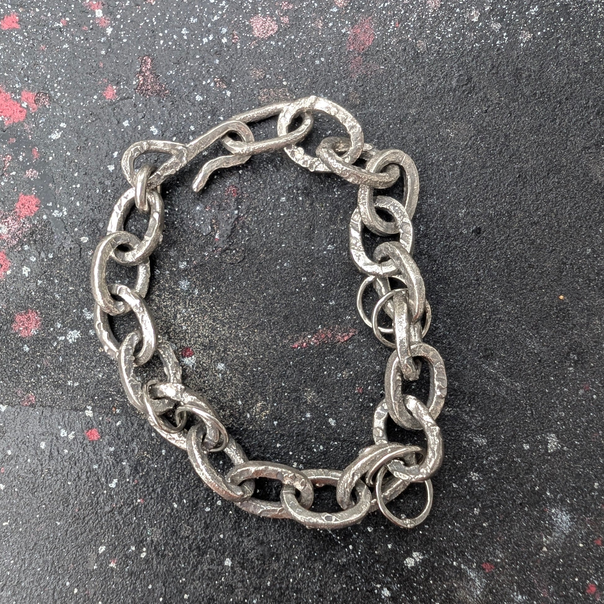 Each link scalded with fire creating a scorched texture which is oxidised. Finer hammered links are at random along the chain with a hook style closure