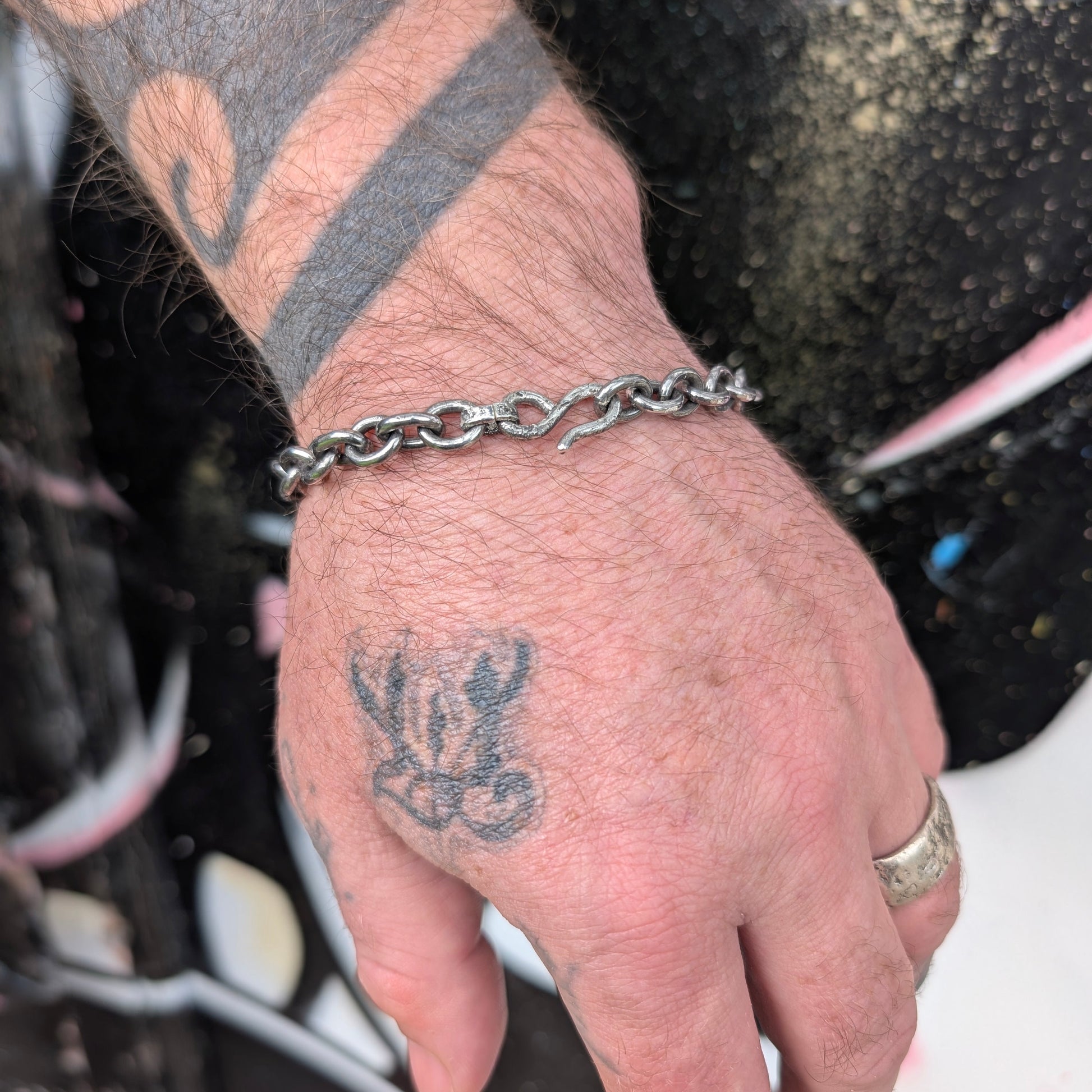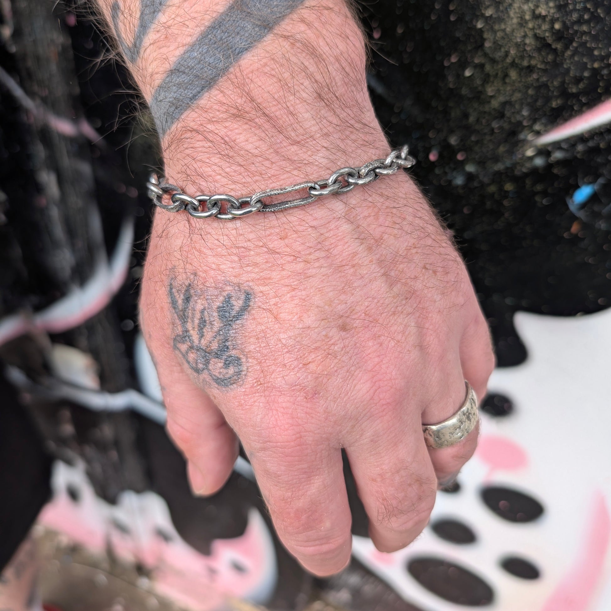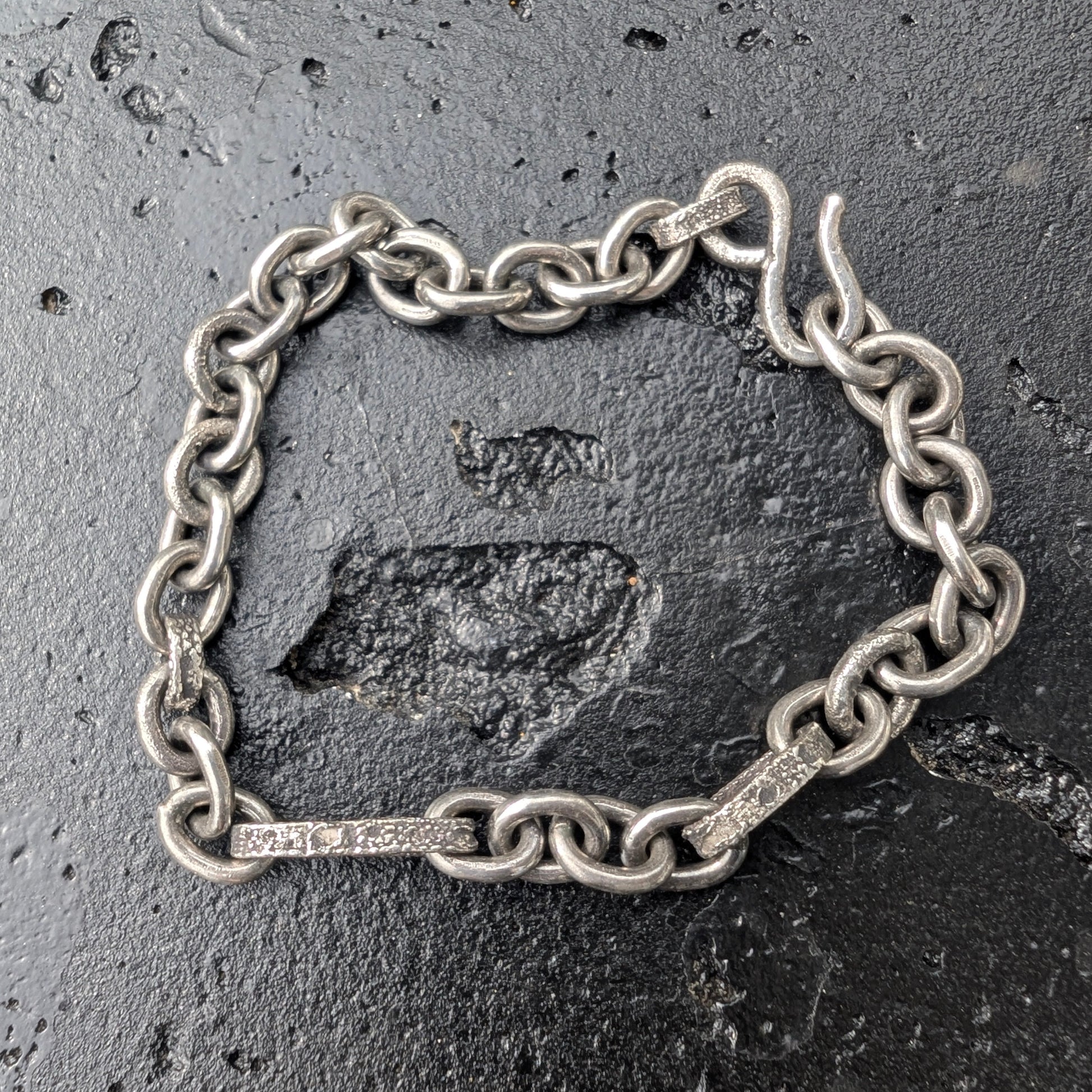 A cable style bracelet with textured rectangular links and a hook closure.
