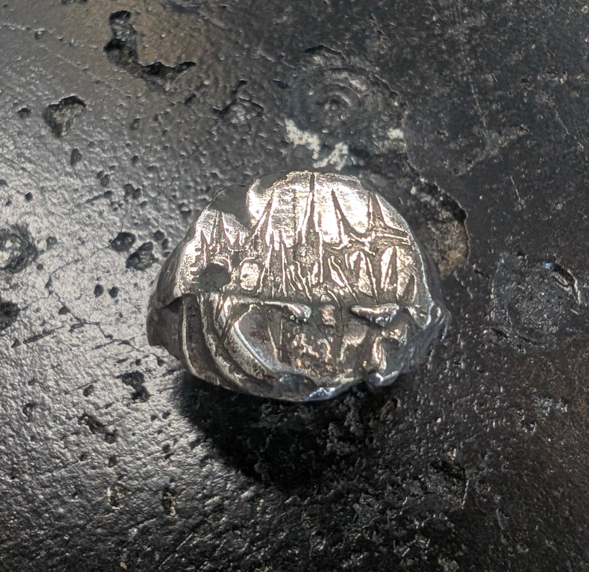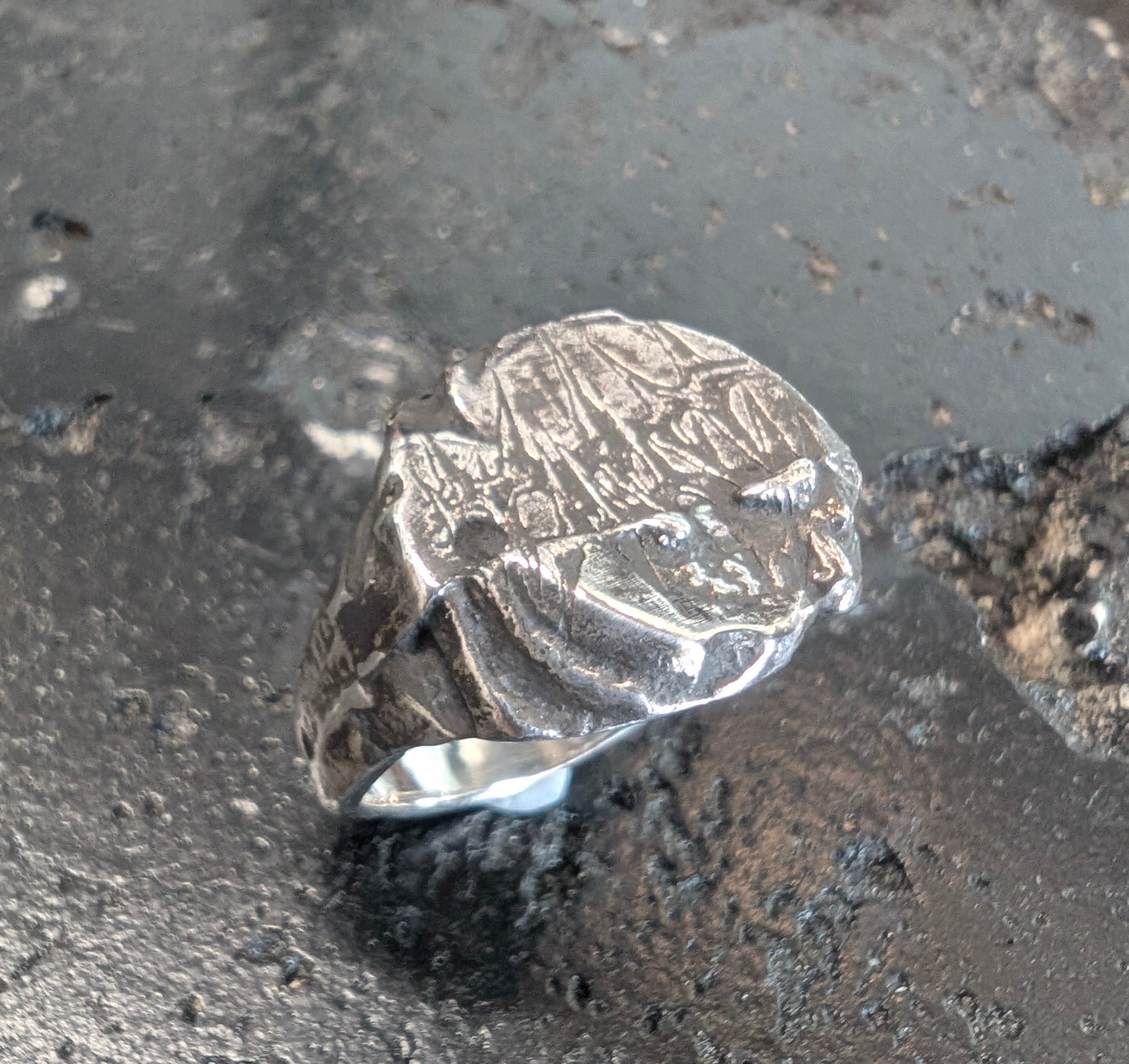 A chunky ring with a grungy texture across face and sides and a thorns design across the face